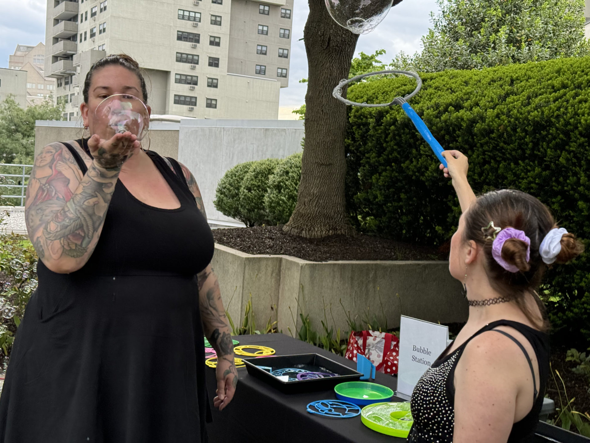 The kids are welcome to play with and explore the bubbles while the artist sits down for face painting, balloon twisting, or glitter tattoos.