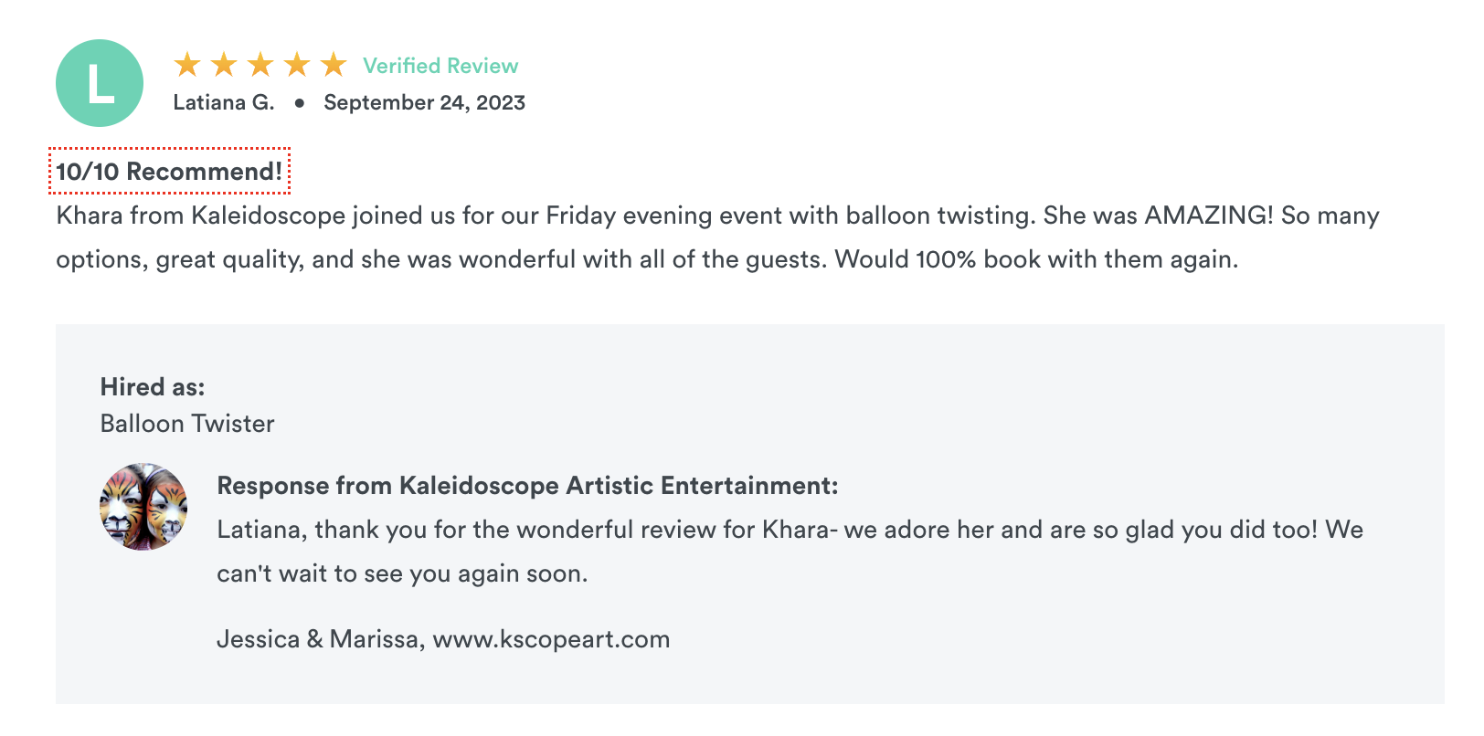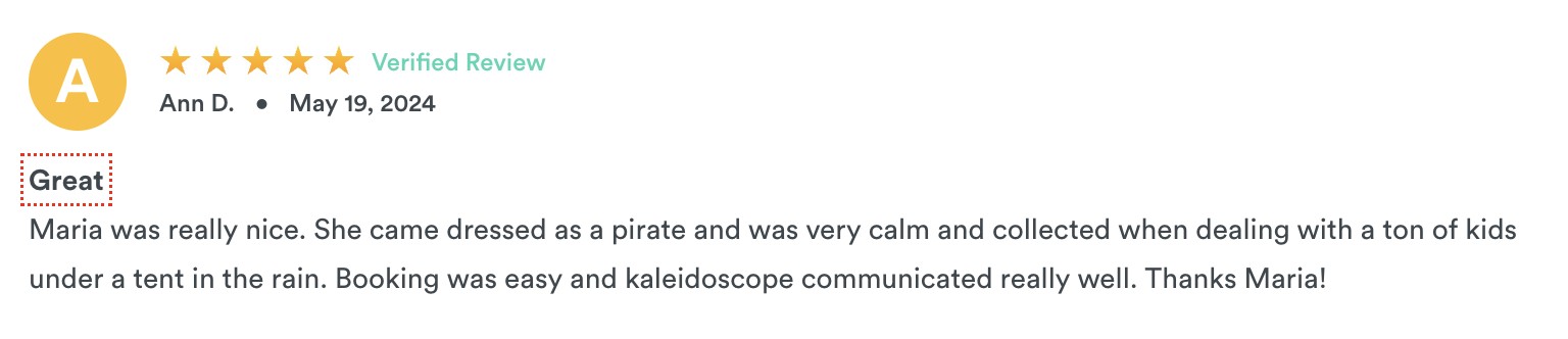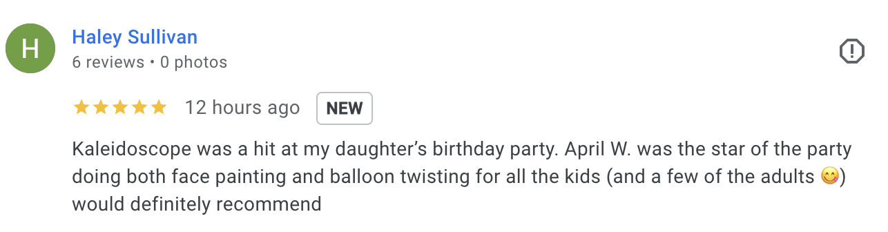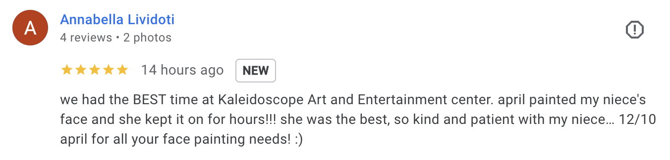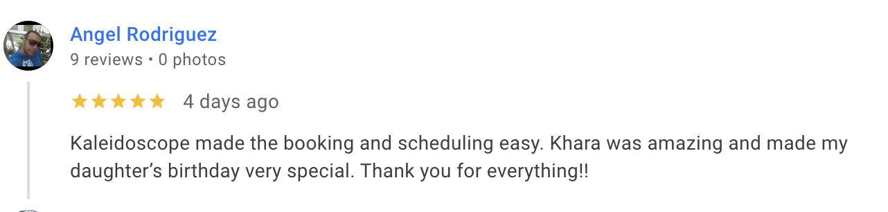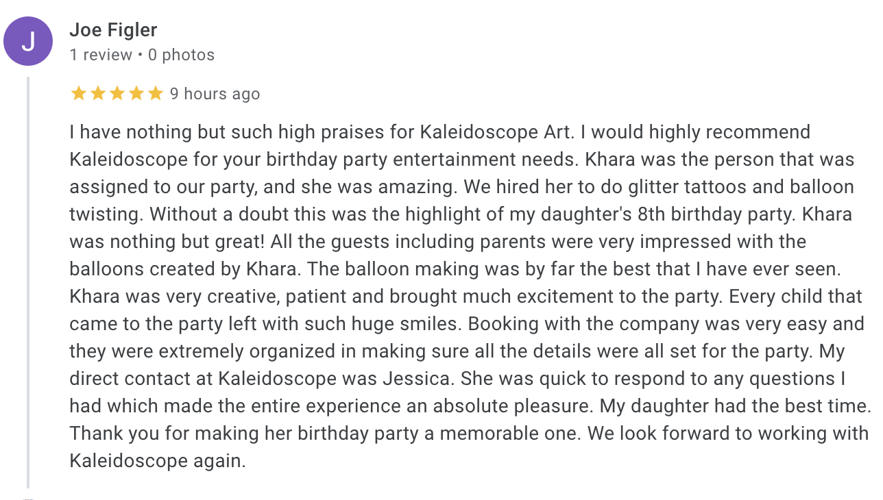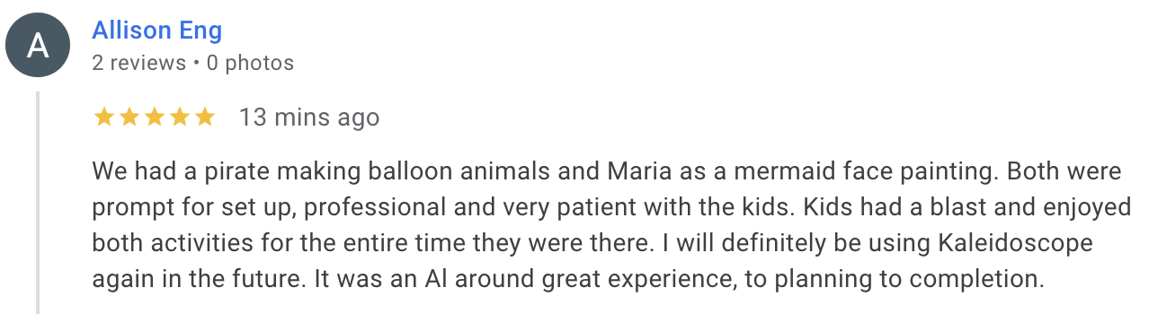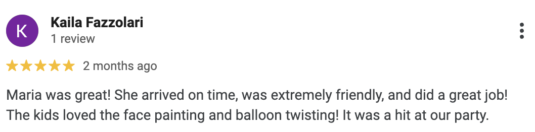 Maria began her job as a face painter and balloon twister with Kaleidoscope in 2023 with the goal of finding a creative outlet alongside her corporate tech job. Working full-time at