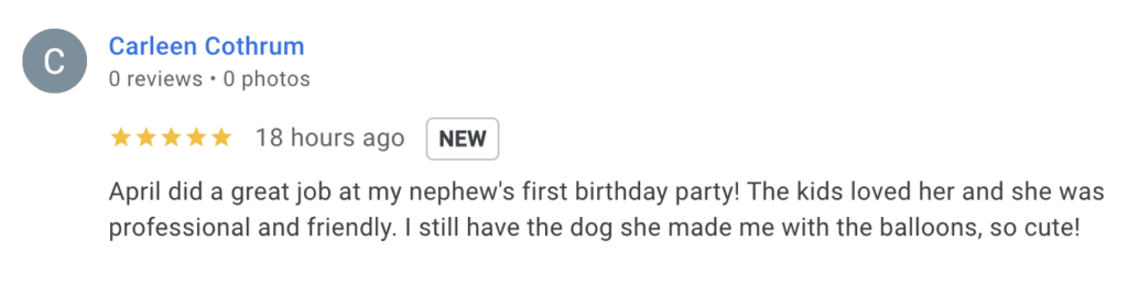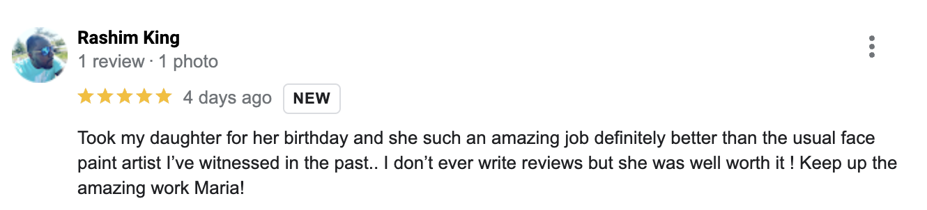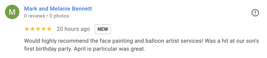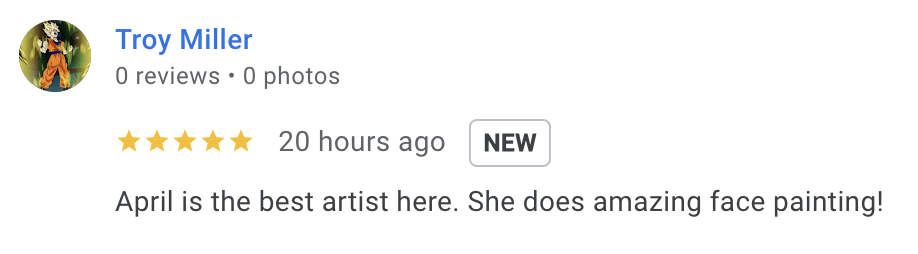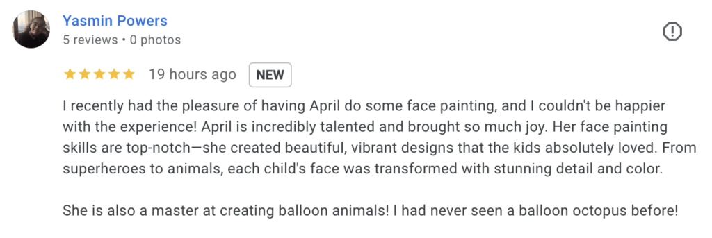 I love art in all of its forms and I thought to myself, “Let’s try something new!” I took the leap to try face painting and balloon twisting and I fell in love with it! I love seeing people’s faces light up when they get their balloon or see their painted face in the mirror!