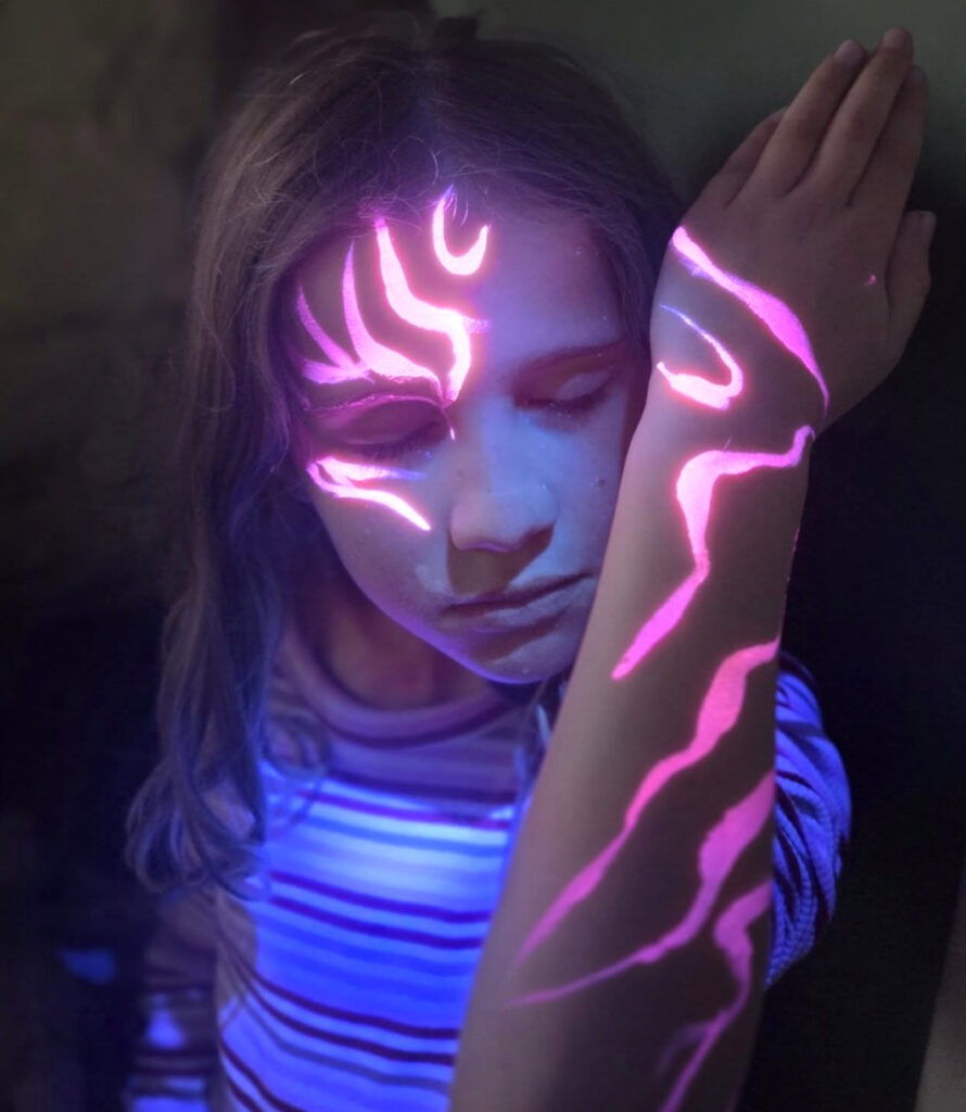 Kids can request “demon marks”, over-the-top colorful makeup, or even a derpy tiger–all of which will glow under UV light.
