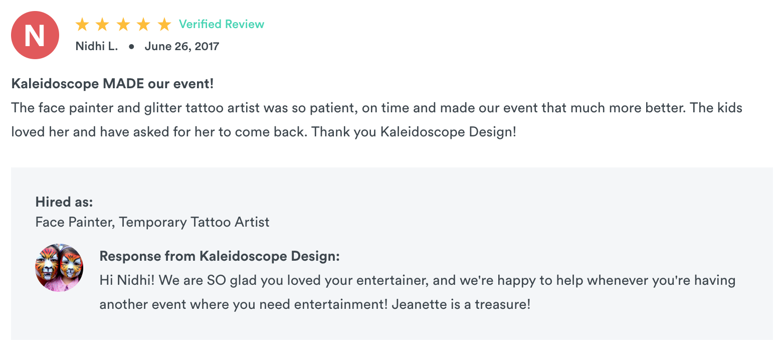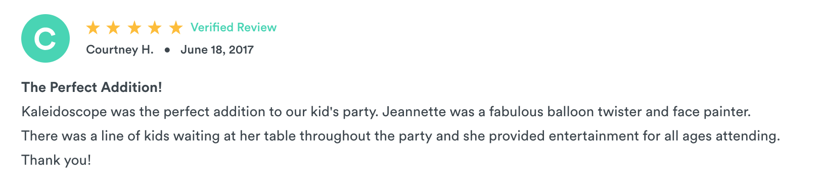 Jeanette A has been with Kaleidoscope since 2016 and while she started as a princess, she quickly rose to Kaleido-fame as an amazing face painter and balloon twister! (Not to mention most types of temporary tattoos and other cartoon characters, but who’s counting?)