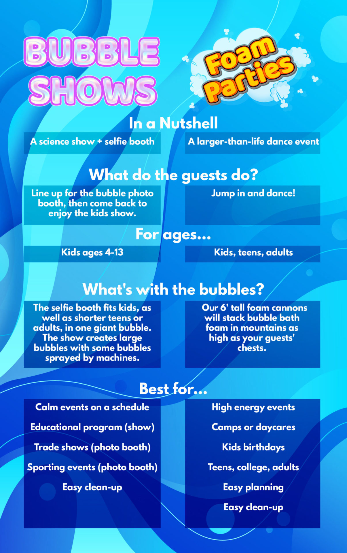 - And if you want even more bubbles, we suggest you throw a soapy-dance-party with our foam parties!