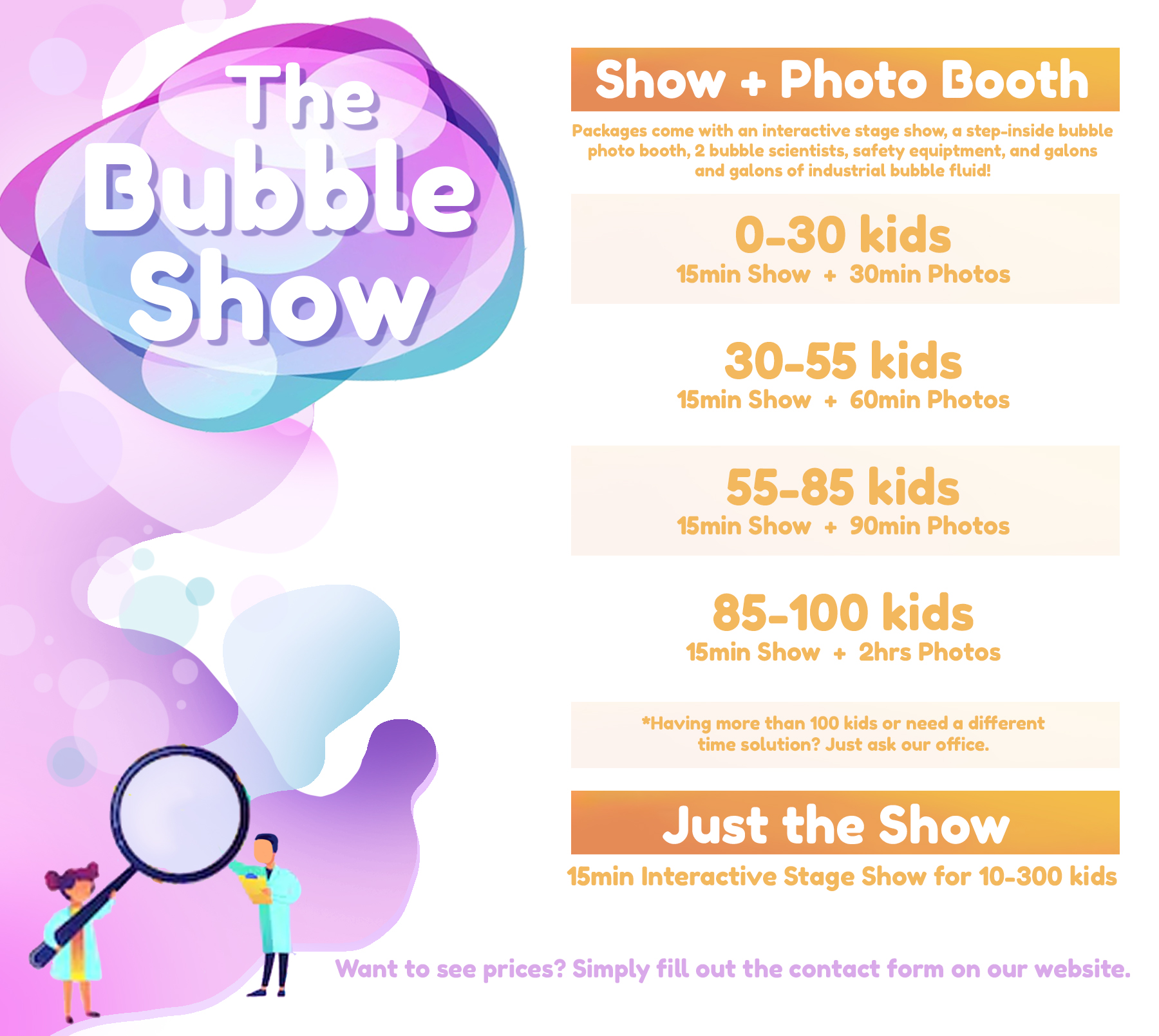 Yes! The bubble show was created with schools, daycares, and camps in mind with the goal of mixing entertainment and education by a former classroom teacher on our office staff.