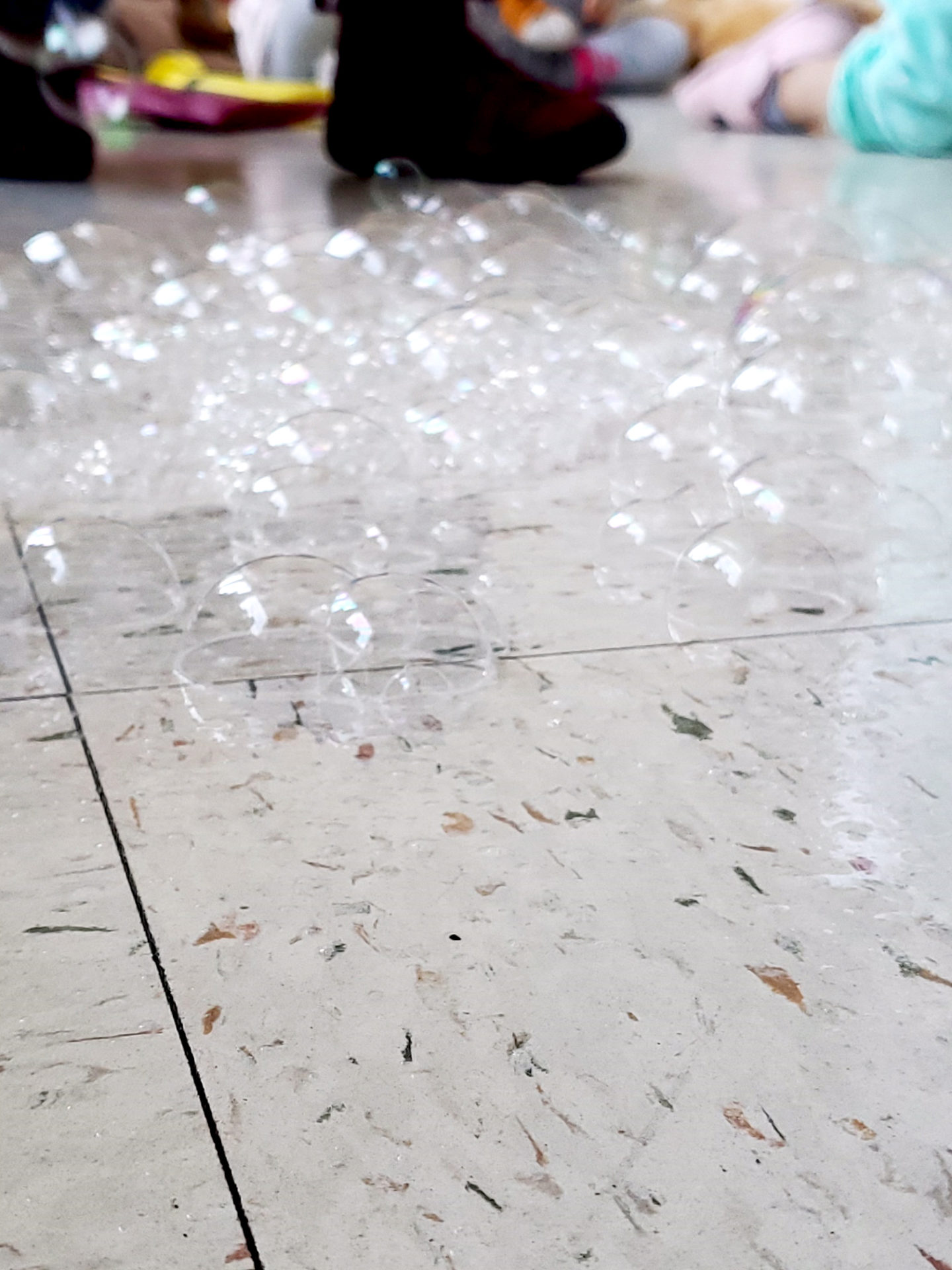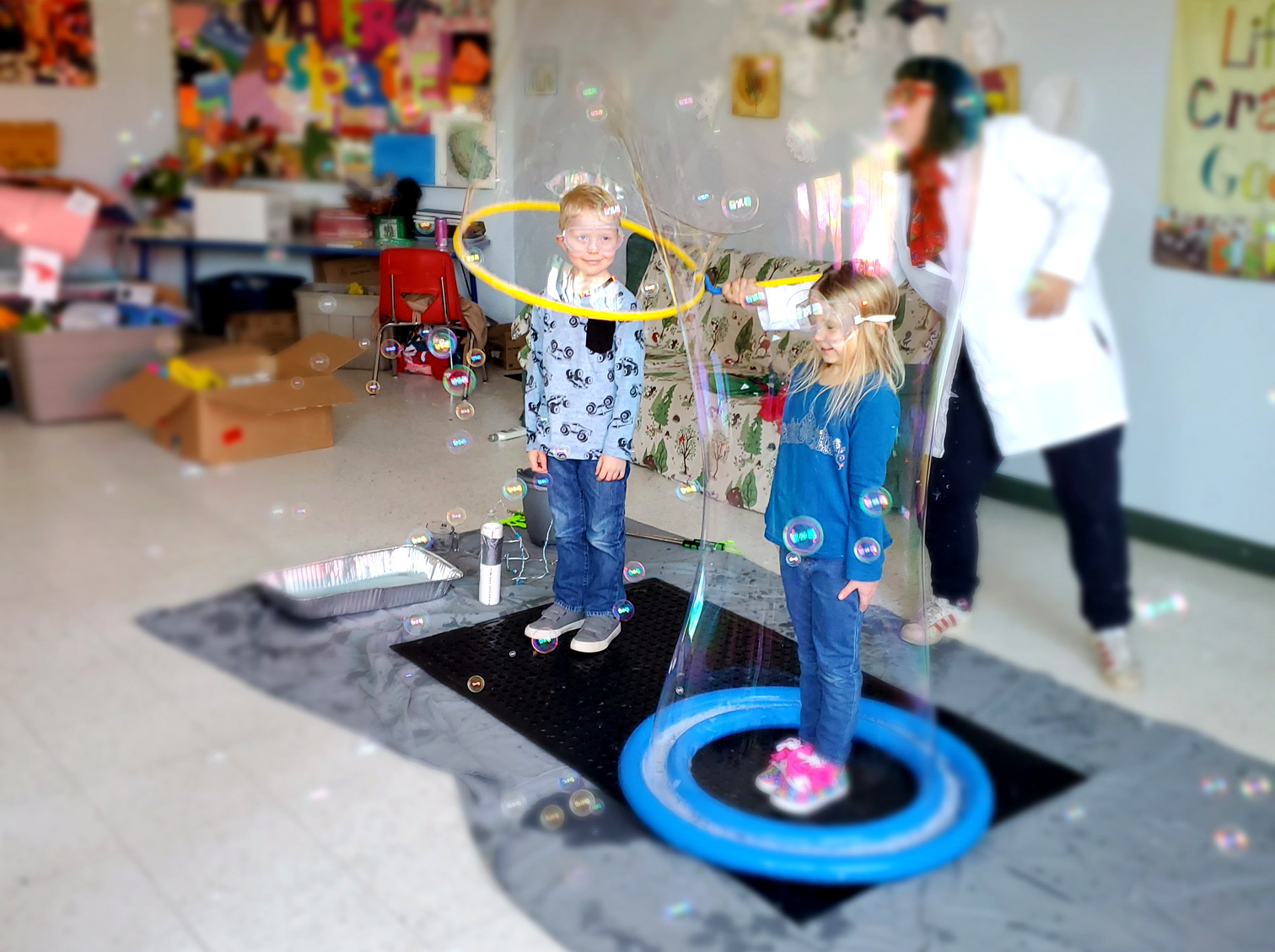 Dr. Bubbles will set up an “experimentation station” free play are for kids who want to get their hands on bubbles after the show! The bubble free play station comes with: