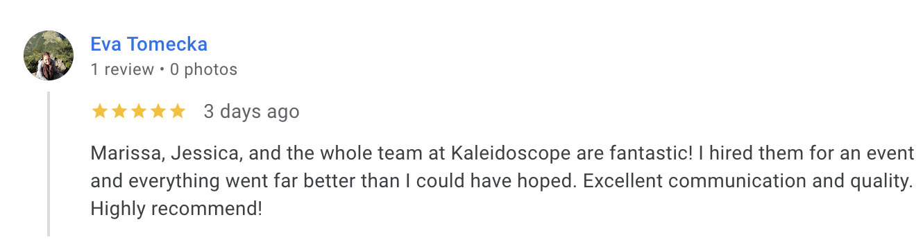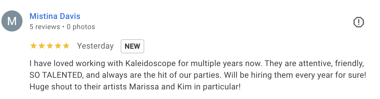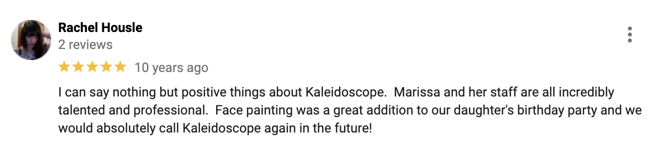 Marissa also works in the Kaleidoscope office as the Head of Talent and is involved in hiring, training, and managing all of our amazing party artists, as well as with anything else the office might need. (If you’ve had one of our artists at your event, odds are they were trained by Marissa!)